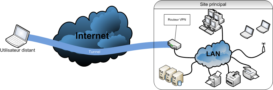 Dibuja el esquema de varias redes físicas distantes que se comunican mediante un tunel VPN.